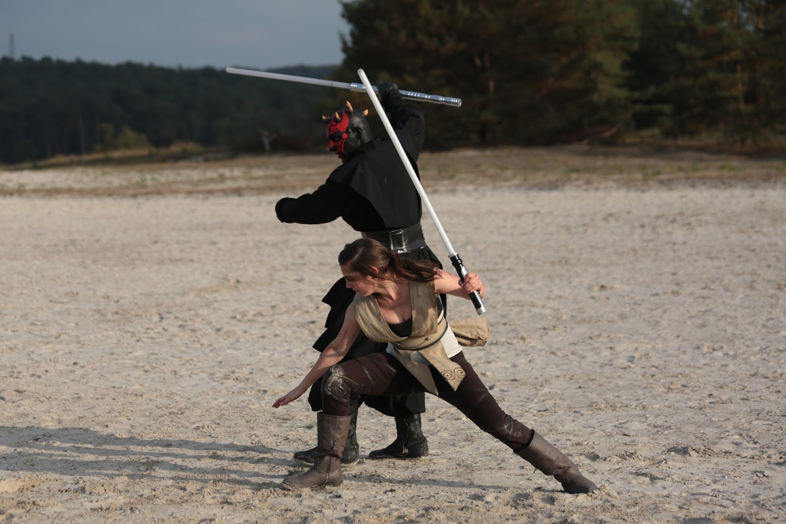 SB: The Jedi apprentice was the most important character next to Darth Maul and casting her was not easy! First, I was looking for the right actress to fit the part – wuo can act as well as filmfight. After a while of searching, however, I realized that I had to decide between the acting or the fight experience. In the end for this part, the acting experience became more important and Svenja Jung’s portrayal and execution of her character’s fighting skills and prowess was something that Vi-Dan had to create with her through training, choreography and sometimes using a double. Still, Svenja did all the wire stunts herself!